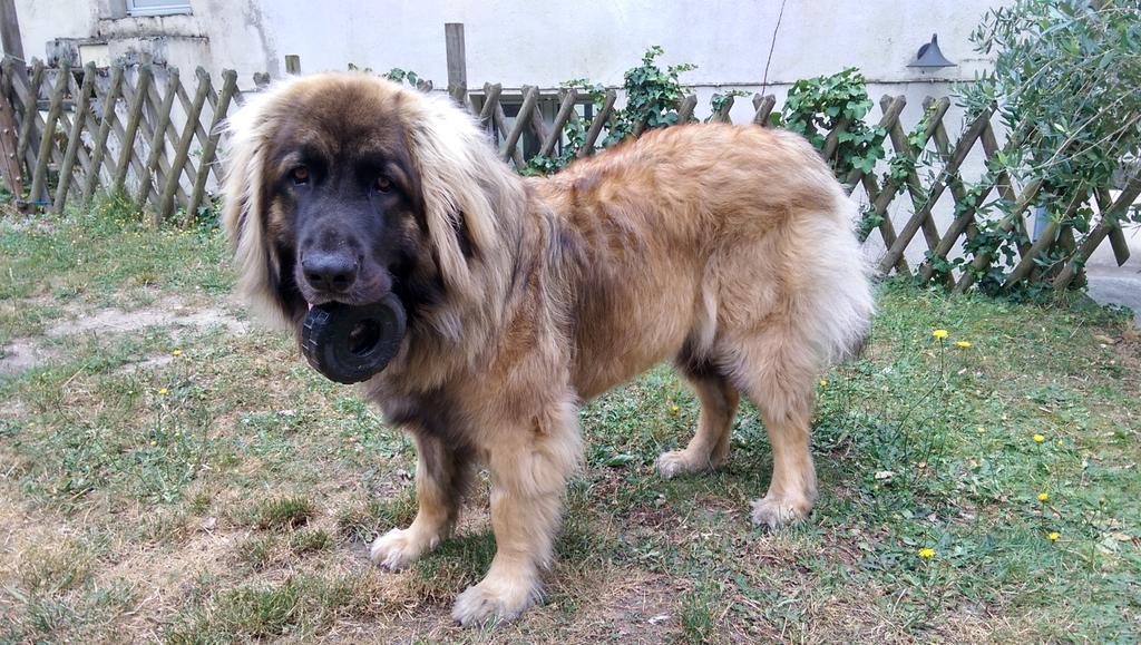 C’est vrai qu’il est mignon ! Ah d’ailleurs, pour faire une présentation plus complète de la bestiole, c’est un bâtard. Son père est un Montagne des Pyrénées et sa mère une… Léonberg !!! Ha ha ha… Tu ne t’y attendait pas du tout ! Ce qui fait qu’il est de taille moyen-grand, qu’il a les pattes blanches avec un dégradé sable et le dos roux, qu’il a la queue du Léonberg mais qu’il n’a pas le masque noir spécifique à cette race. Donc voilà. Je vous montre tout cela en images (comparatives) !!! Je sais les images ne sont pas centrées mais c’est pour mieux que vous étudiez le cas…