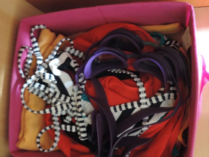 Et encore à droite, se trouve le dernier bac, il contient mes affaires de baignade (la plage ou de la piscine) : mes maillots de bain, mes lunettes de plongée, mes serviettes de bain…
