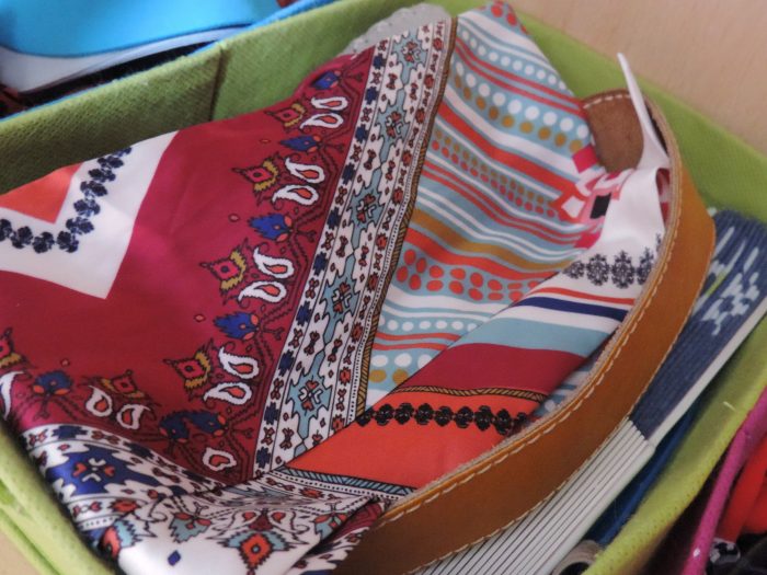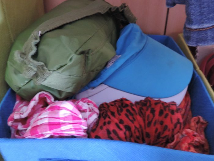 A droite, se trouvent mes foulards, mon k-way et deux casquettes.
