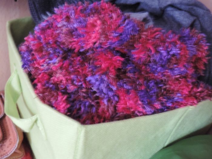 Et dans le bac de tout en bas à gauche, il y a mes affaires d’hiver : mes gants, mes écharpes, mes bonnets, mes mitaines, mes trucs pour rendre les chaussures plus chaudes… (photo très floue)