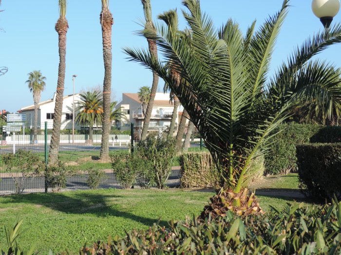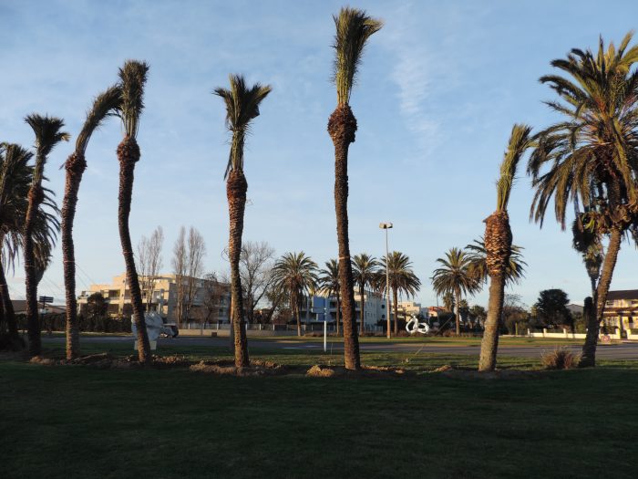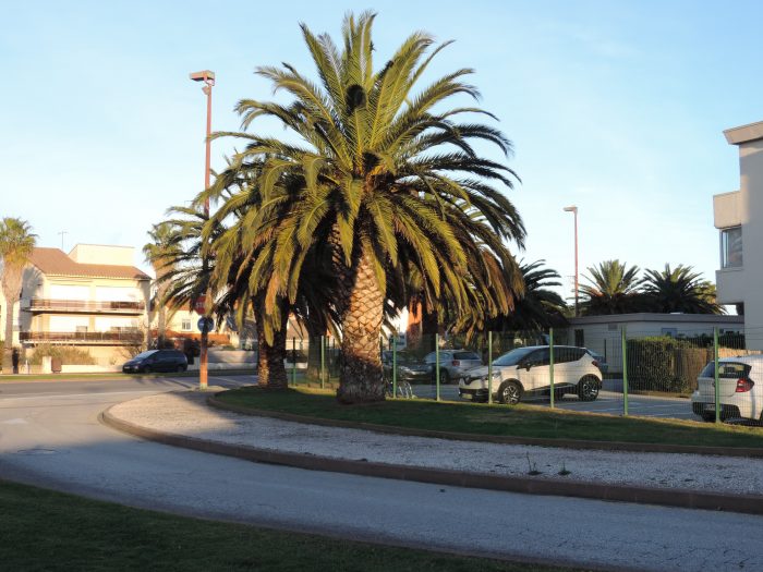 Ici, c’est presque chez moi… 😀 Regardez, la commune a installé des palmiers venus d’Espagne sur le rond point… Mais, des bestioles les ont attaqué, on leur a donc fait une coupe de palmier ! 😛