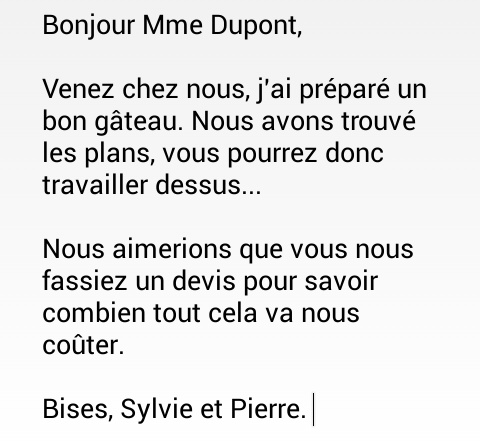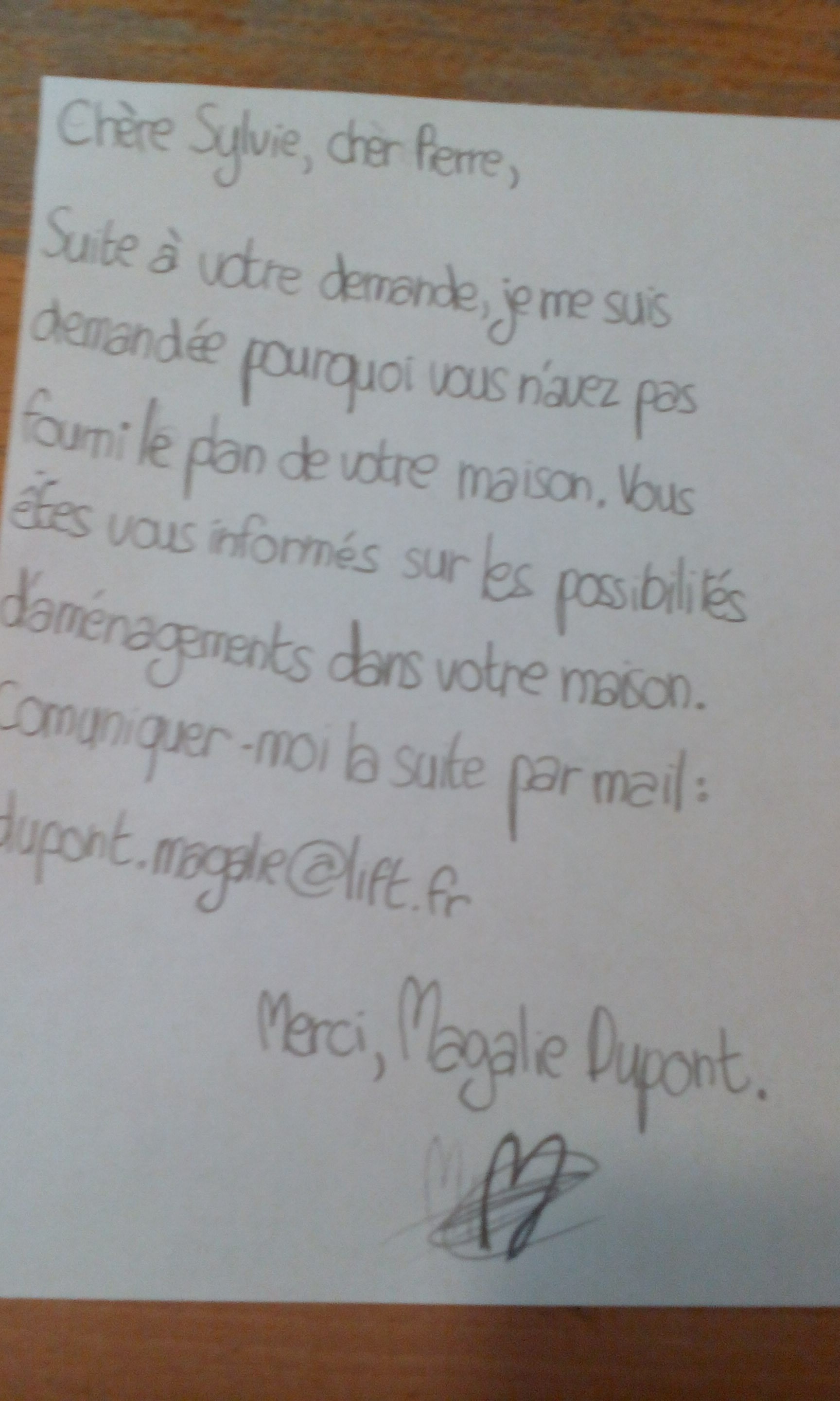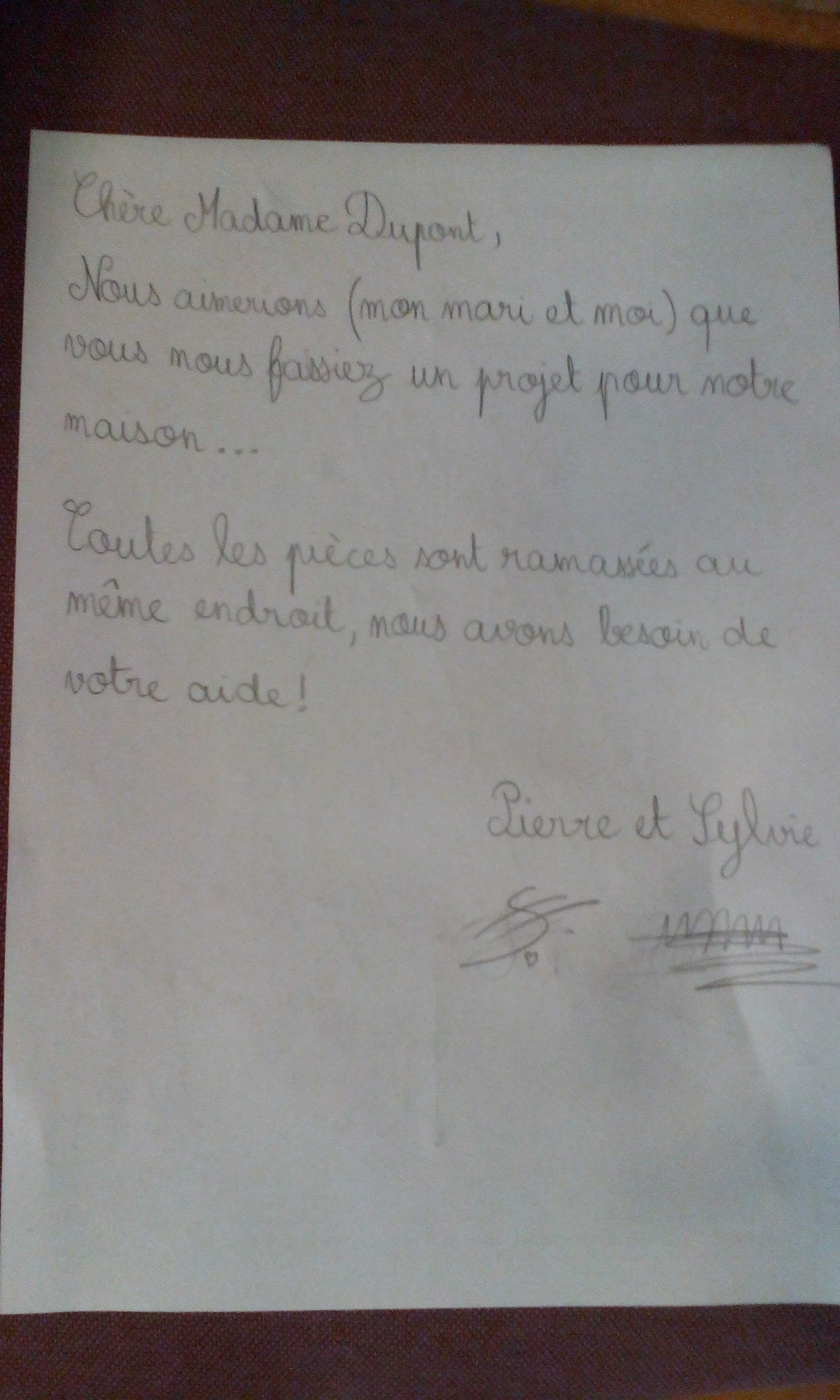 Alors ils décident de faire appel à un architecte pour qu’il l’observe et prévoie des aménagements pour la maison. Mais comme Pierre et Sylvie n’ont pas de téléphone (car ils sont à la rue avec la technologie), ils écrivent une lettre :