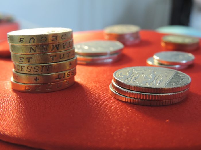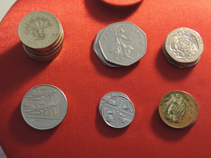 Bref, je vous raconterai ce voyage une prochaine fois, là, je vais vous montrer toutes les pièces de monnaie que j’ai, celles que j’ai en plus grand nombre sont les livres (£), mais j’ai aussi des dollars ($), des euros (€) et des trucs du Canada, des dollars je crois ($)…